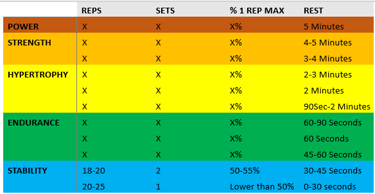 Sets, Reps and Intensity- You will be given a table explaining how training at different rep ranges can affect your body. For example, training at 3 sets of 10 reps will be classed as endurance and will burn fat and improve muscular endurance. However training at 4 sets of 6-8 reps will be classed as hypertrophy and you will build muscle and increase strength.