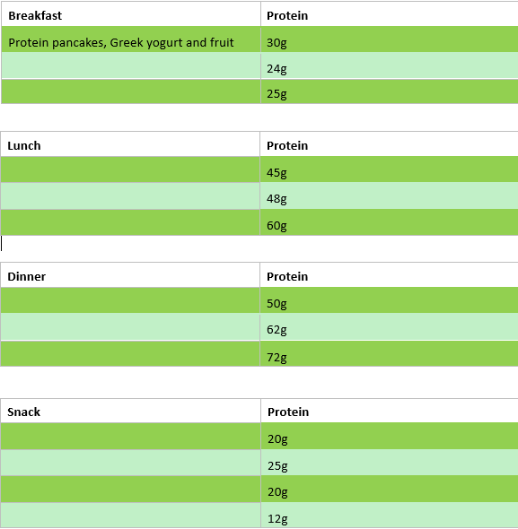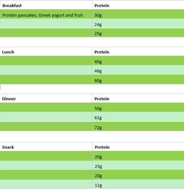Protein - You will learn how much protein to consume per day depending on your body weight and there will be a table of breakfast, lunch, dinner and snack ideas. Each meal will tell you how much protein is in them to help you keep track.