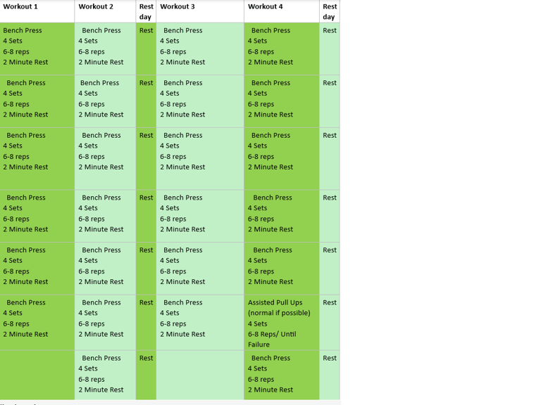 You will be given a training program that has 4 working days in it and 2 rest days in between. It will show you what exercises to do on certain days and how many sets and reps to do and also how much rest to take between sets.